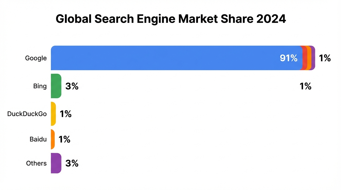 Les données parlent d'elles-mêmes : Google écrase la concurrence en France avec une part de marché autour de 91 à 93 % sur desktop, et encore plus élevée sur mobile. Voici comment se répartit le reste du marché :